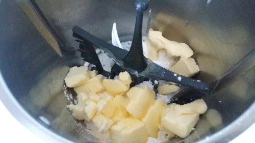 - Dejamos la mantequilla a temperatura ambiente y cortada a dados para que adquiera una textura pomada, blanda pero no deshecha.