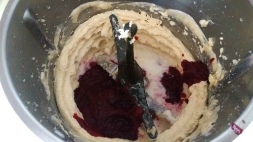- A nuestra masa, incorporamos la pasta de vainilla y el puré de remolacha.
