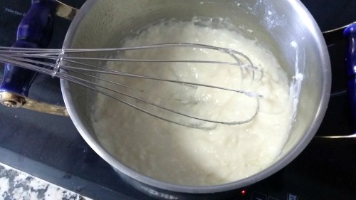 Con unas varillas, removemos bien para que no se formen grumos. Ponemos en un cazo a fuego medio, y veréis como se va formando una bechamel. Debemos ir mezclando con unas varillas sin parar para que no se pegue en la base del cazo. Cuando la bechamel esté densa y pastosa, retiramos del fuego. Dejamos enfriar por completo a temperatura ambiente.