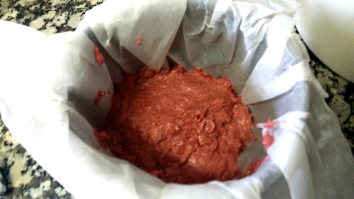 - Repartimos la mezcla de nuestro Red Velvet en los tres moldes, a partes iguales.
