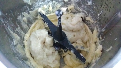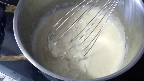 - Añadimos la bechamel (que ya estará fría - es muy importante que no esté nada caliente o puede deshacer la mantequilla y no conseguiremos obtener la crema). Seguimos batiendo durante 1 minuto hasta que se integre por completo y no haya grumos.