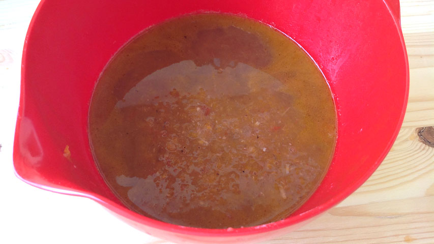 Así queda la salsa pasada a mano. Si la trituras con una máquina quedará todo mejor triturado y también el color será más claro.