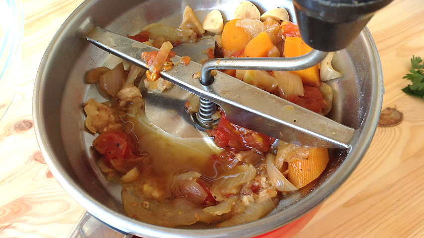 Podemos triturar las verduras a mano como hago yo con este pasapurés o bien utilizar una máquina que lo dejará más fino.