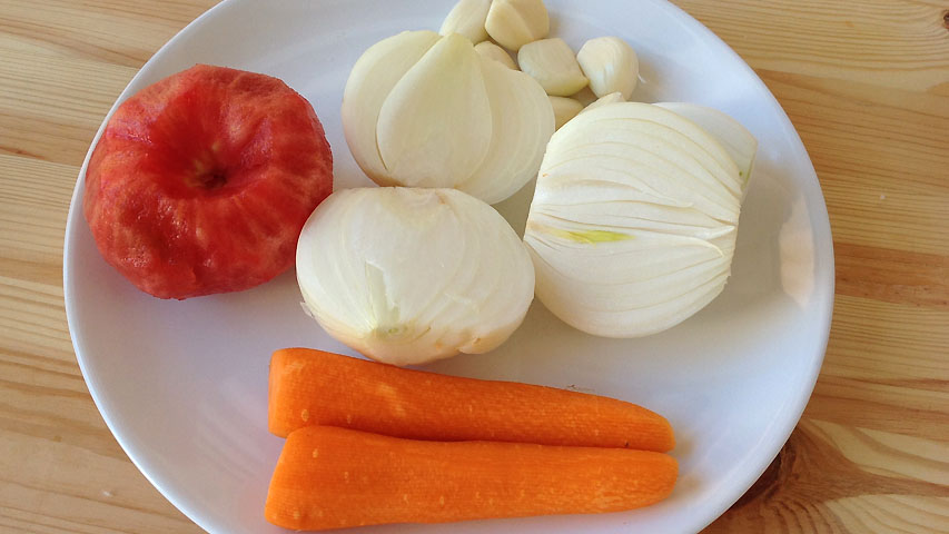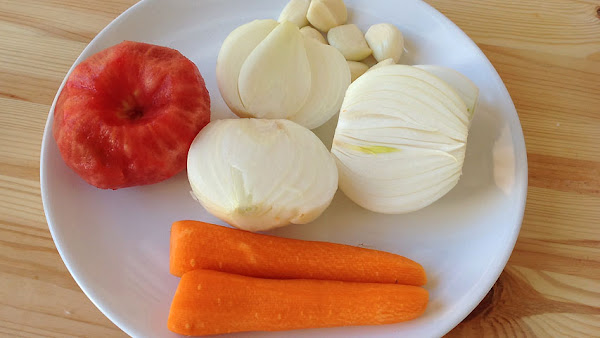 Pela y trocea todas las verduras. El troceado no ha de ser muy refinado porque después vamos a pasar las verduras.