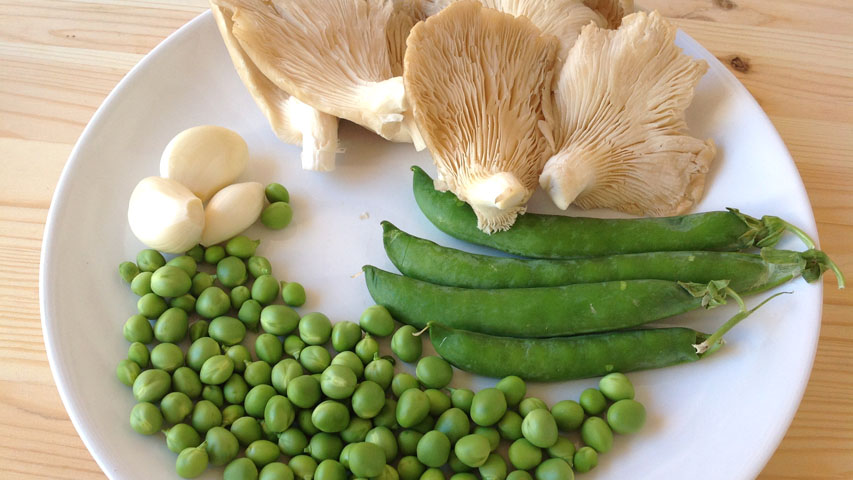 En una sartén a fuego medio-alto con un poco de aceite de oliva sofríe el resto de ajos en láminas, las setas troceadas y los guisantes. Sazona. Tapa y deja que se hagan unos 3 minutos a fuego lento.