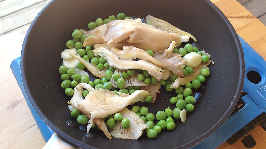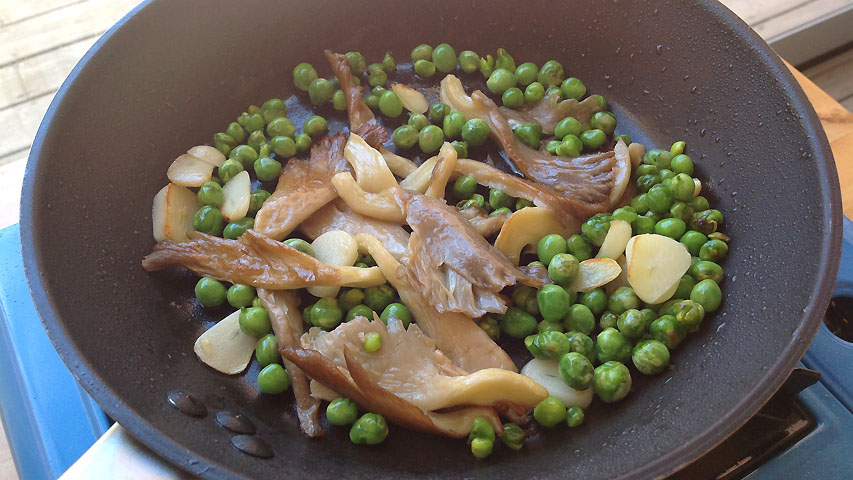 Aquí estoy salteando la guarnición. Un poco de aceite con un tres ajos laminados, las setas troceadas y unos cuantos guisantes frescos.