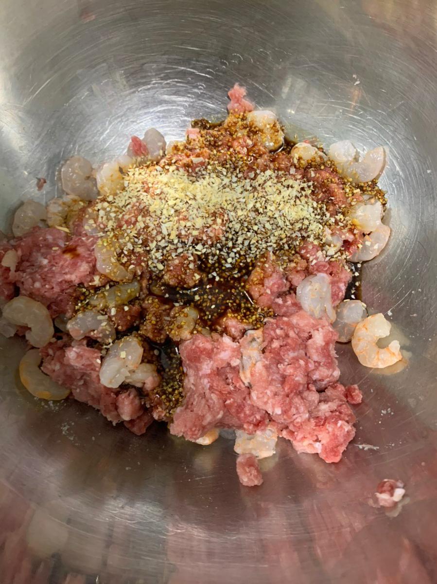 Seguidamente ponemos la carne picada con las gambas bien escurridas y aderezamos al gusto. Aquí si que cada uno puede ponerle lo que quiera. A mi me gusta con soja y mostaza por que le da un toque mas fuerte de gusto. Pero sino te gusta solo con la sal , la pimienta y si quieres alguna hierba mas también queda muy bien. Y lo mezclamos todo para que quede integrado.
