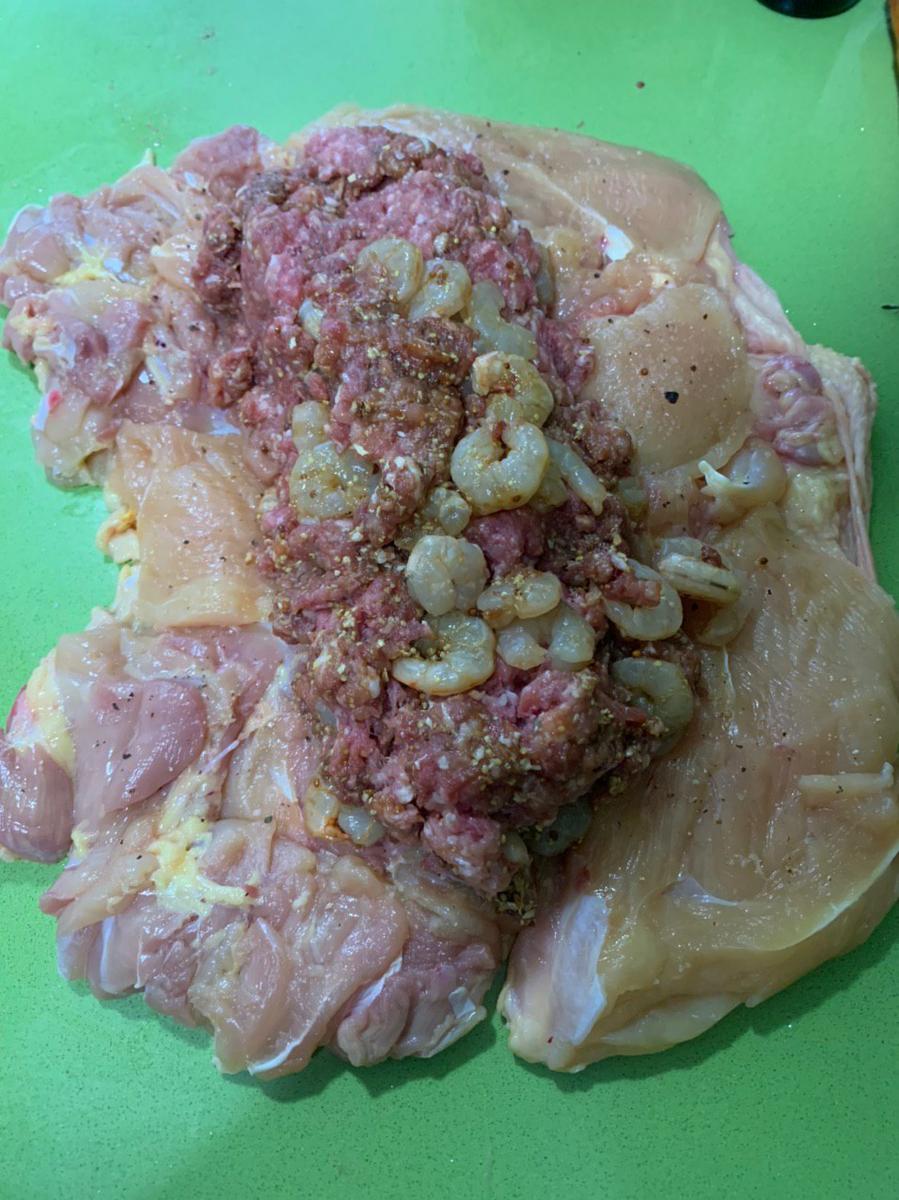 vuelvo a pasarme por aquí para traeros una receta buenísima. Es un redondo de pollo relleno. Si que es verdad que lo bueno del pollo es que lo puedes rellenar de lo que quieras. Setas, verduras, frutos secos, gambas…. Yo hoy os traigo un redondo relleno de carne y gambas. Eso si yo os recomiendo que sino habéis deshuesado nunca un pollo lo pidáis en vuestra carnicería que os lo preparen por que sino puede ser que lo rompáis. Yo hacia un tiempo que no lo hacia y lo destroce un poco. Espero que os guste la receta y como siempre digo hacerla a vuestra manera.