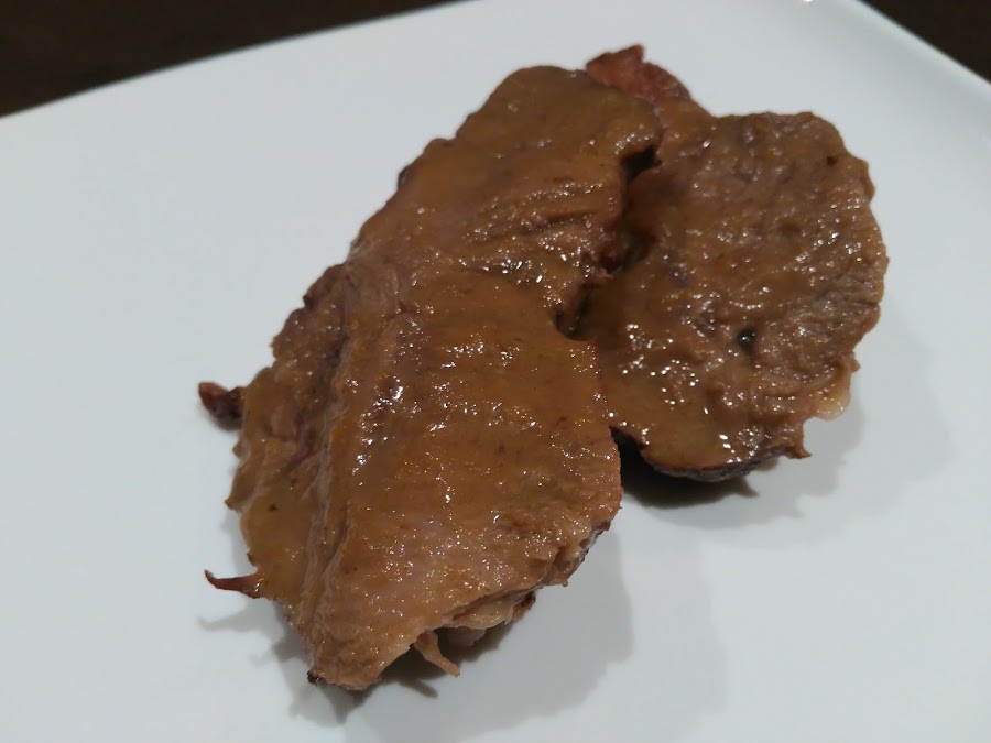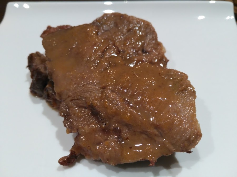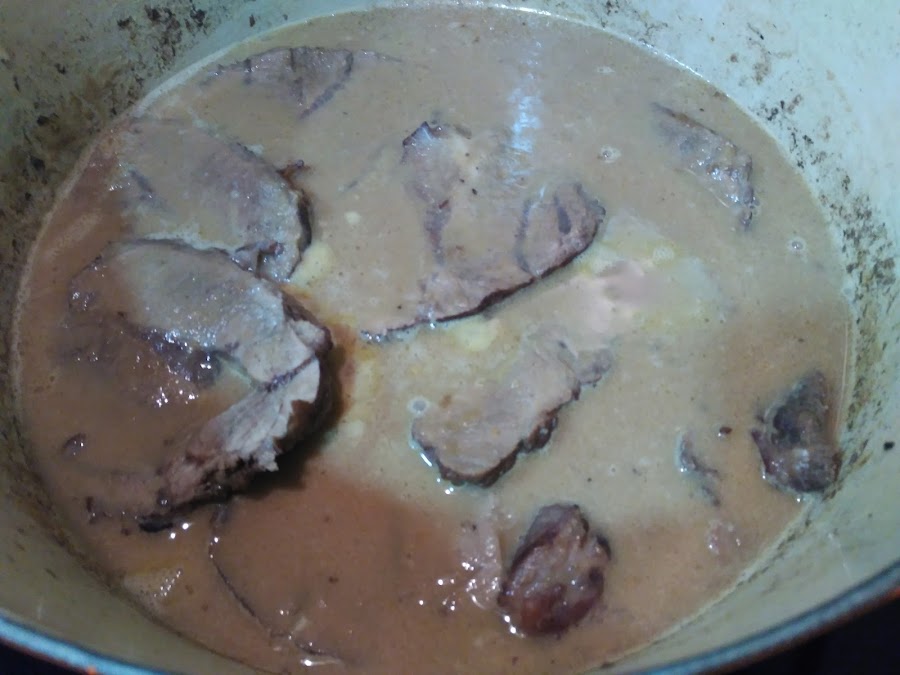 - Devolver la salsa a la cocotte, lonchear la pieza de carne, y añadirla a la salsa.