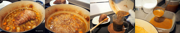 Colocar la cazuela en el fuego y reducir el caldo. Retirar las hierbas y la canela y triturar las verduras hasta obtener una salsa fina.