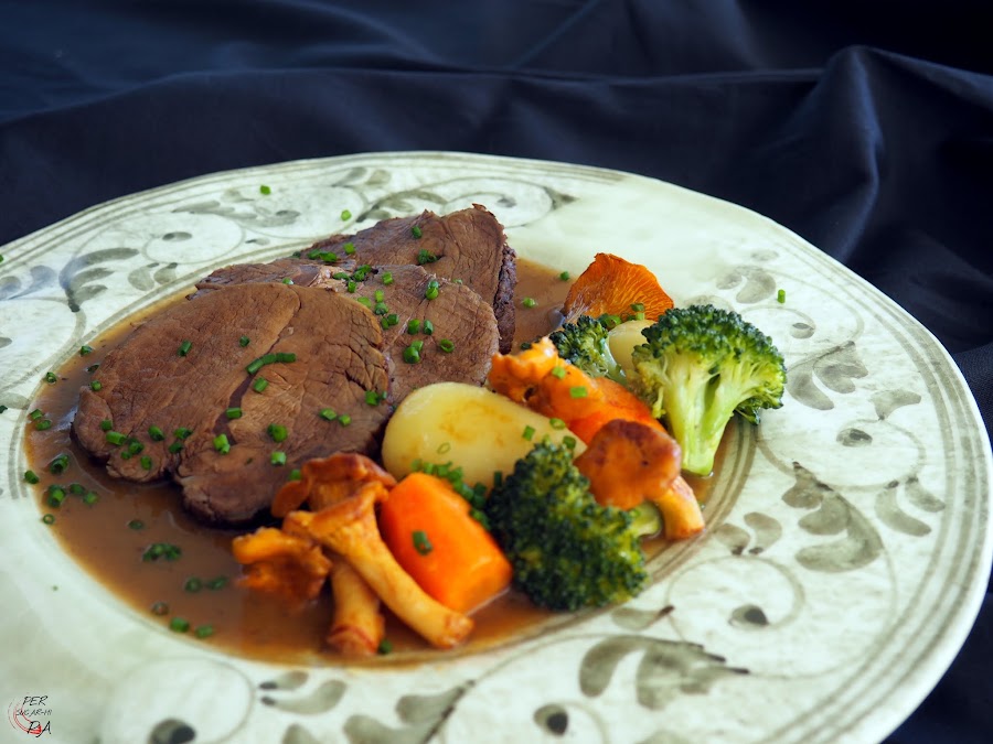 Cortar el redondo de ternera en lonchas no muy gruesas. Servir sobre un lecho de salsa y acompañado de verduras. En este caso patatitas y zanahorias cocidas y salteadas, setas y brécol al vapor.