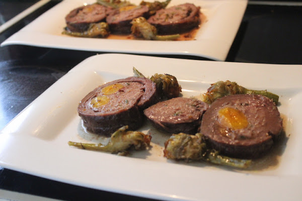 En esta ocasión he optado por trabajar poco, como viene siendo habitual en mí últimamente, he preparado un redondo de ternera relleno, de los que nos venden preparados en el supermercado, acompañado de dos alcachofas grandes confitadas.