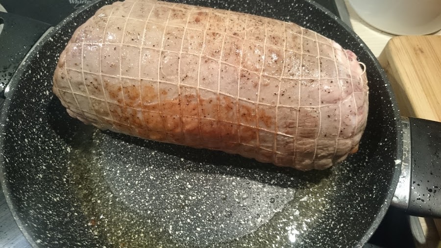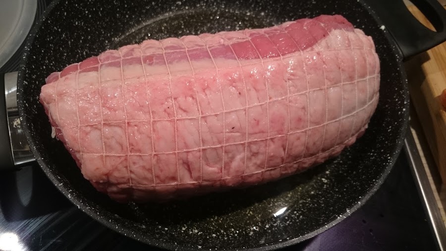 En una cocotte o rondón echamos aceite de oliva y vamos a ir marcando el redondo a fuego vivo. Esto logrará retener los jugos y le daremos un bonito color dorado a la parte exterior. Con dos minutos por cada lado será suficiente. Retiramos.