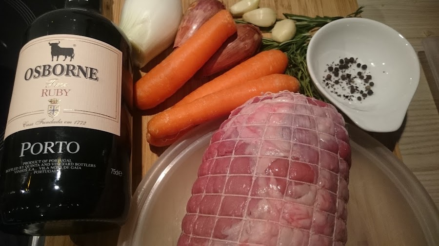 Enseguida añadimos el redondo de ternera de vuelta a la cazuela y subimos el fuego. Vertemos el vino de Oporto. Dejamos que rompa el hervor y bajamos la potencia. Tapamos la olla y dejamos cocinar unos 45 minutos a fuego suave, sin prisa, a su ritmo. NOTA: Habrá que ir dando la vuelta al redondo cada 15 minutos.