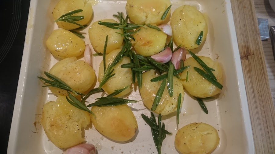 Pelamos las patatitas y las ponemos a cocer en agua durante 10 minutos. Colamos y las pasamos a una bandeja de horno. Dejamos cocinar unos 20 minutos. Las sacamos y las aplastamos ligeramente con un machaca-patatas o con un tenedor.