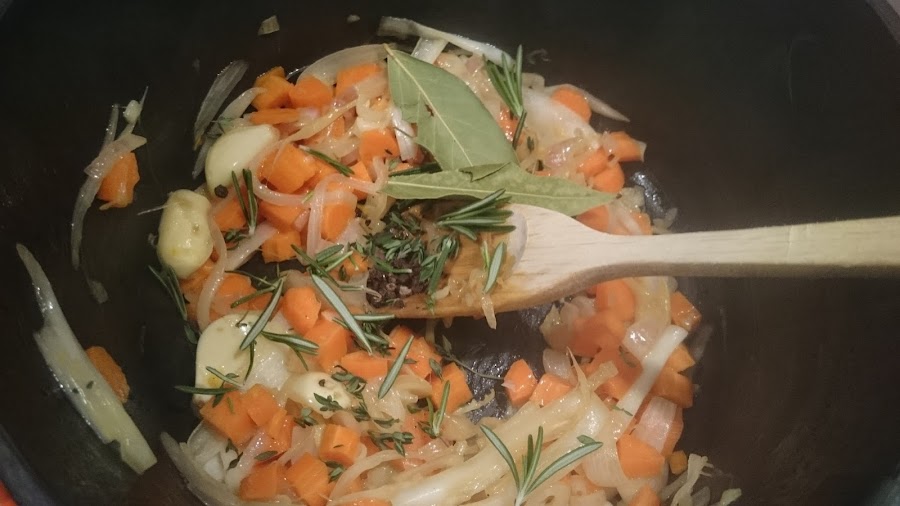 En la misma cazuela con un poco más de aceite, vamos a ir sofriendo la cebolleta, las chalotas, la zanahoria - todas picadas - y el ajo, al que daremos un golpe para machacarlo ligeramente. Pochamos las verduras unos minutos. Incorporamos las hierbas y los granos de pimienta. Removemos.