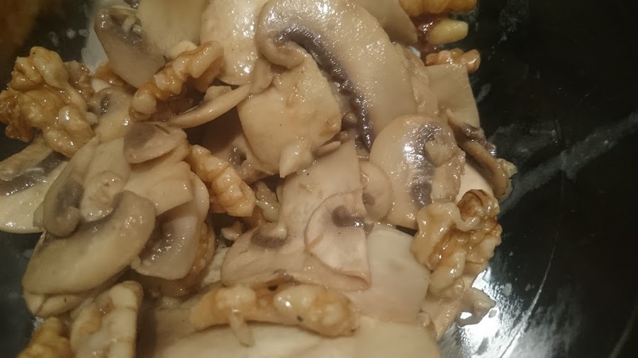 En una sartén echamos un poco de aceite y añadimos los champiñones lavados con el ajo machacado o muy troceado y una pizca de sal. Dejamos que suelten el agua y se cocinen tranquilamente. Incorporamos las nueces y rehogamos todo el conjunto. Reservamos.