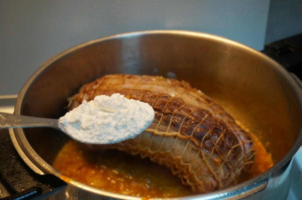 Dejamos que evapore el alcohol como unos 3 minutos y echaremos la cuchara de harina bien colmada.