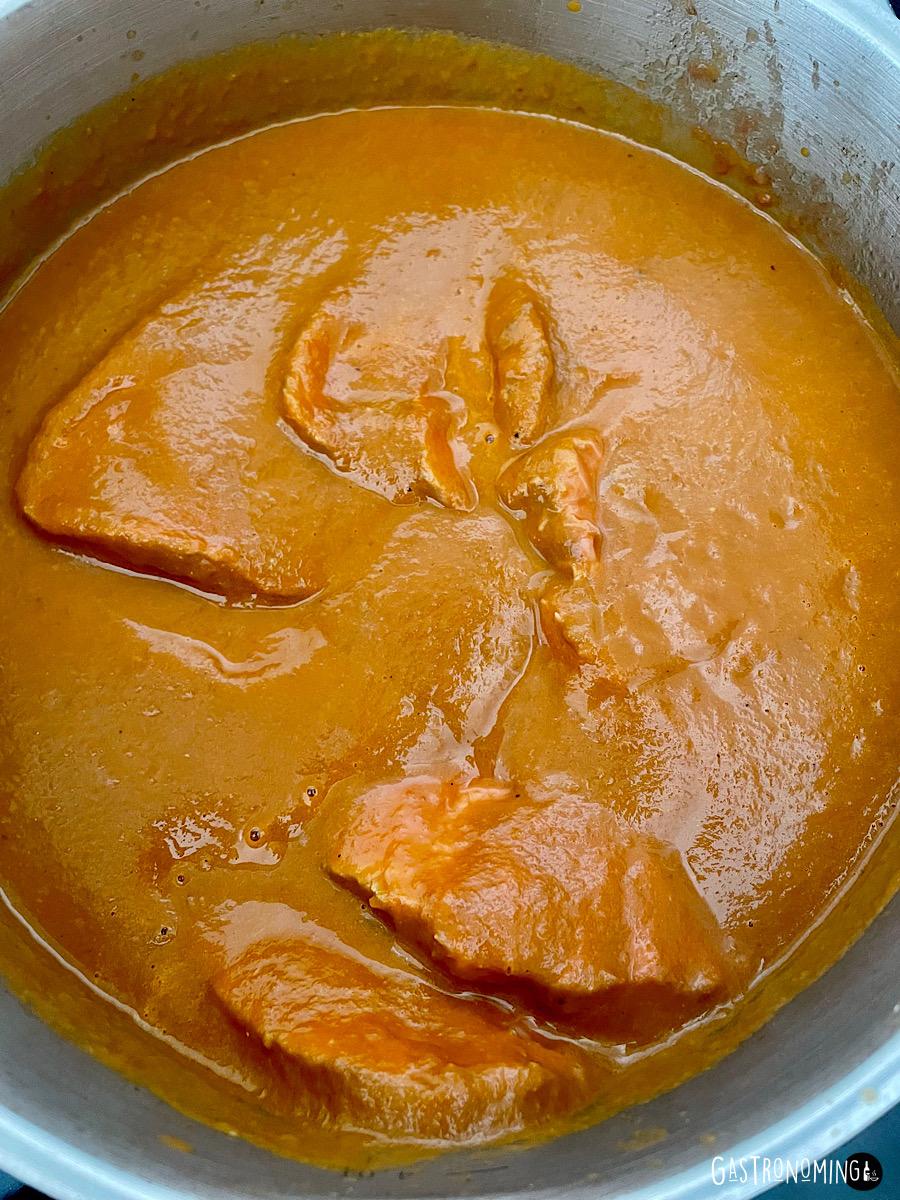 8. Cuando esté todo bien cocido, quitamos la hoja de laurel y trituraremos nuestra salsa a fuego bajo para que no pierda color. Triturar bien, si quieres puedes colar o con triturar bien es suficiente.
