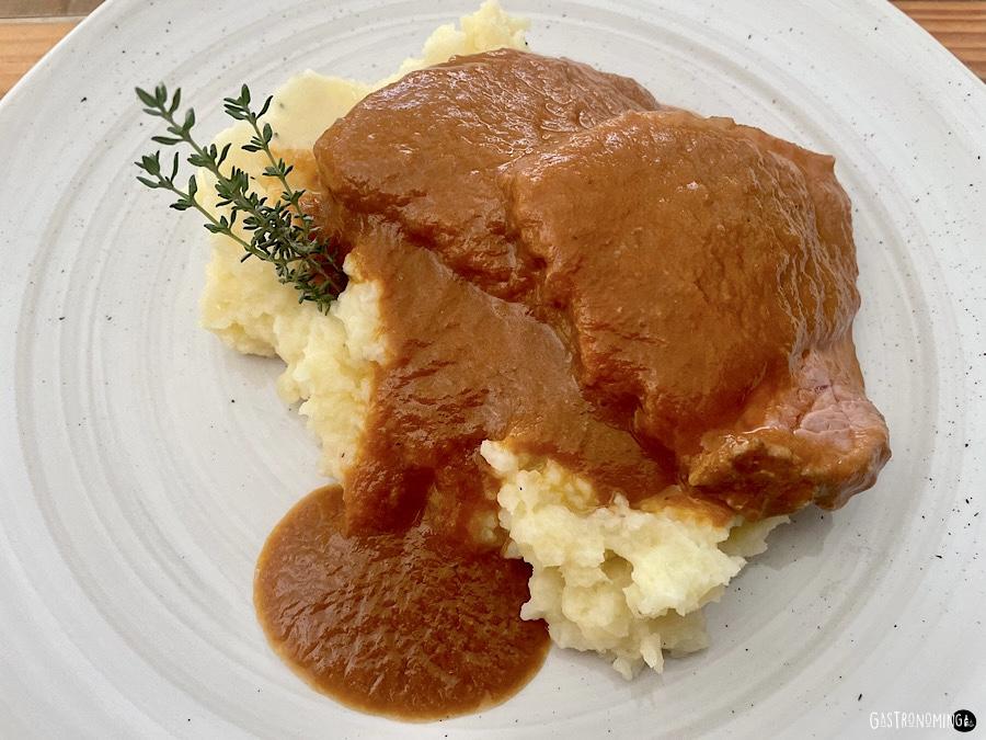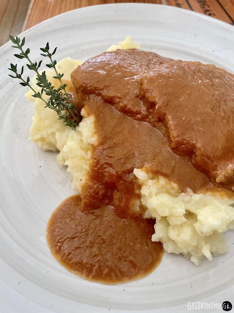 9. Puedes meter a regenerar la carne en la salsa cuando quieras, dos minutos serán suficientes, acompaña la carne con un rústico puré de patatas casero y baña bien la carne con salsa, ahora vas a ponerte de untar hasta el pescuezo.