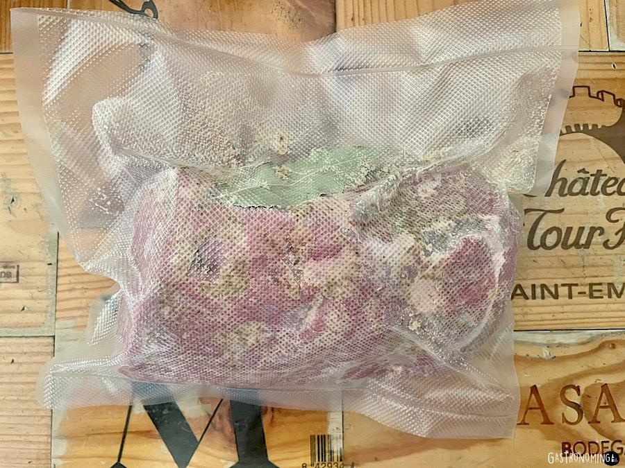 1. Lo primero, encendemos el roner y lo programamos para una cocción de 16 horas a 53ºC (127ºF).2. Untamos la carne ya limpia de excesos de grasas o ternillas con los ajos molidos, le añadimos sal, pimienta negra y comino, guardamos en la bolsa y agregamos el laurel, sellamos.