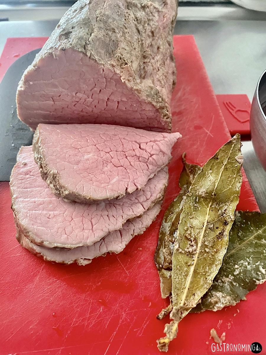 4. Al terminar, si quieres guardar la carne, ya sabes, enfría rápidamente en abundante agua con mucho hielo y al frigorífico o congelador, de lo contrario, si quieres usarla ya, puedes empezar a hacer la salsa, pero antes, abre la bolsa de la carne, deshazte de las hojas de laurel, guarda todo el caldo que ha soltado la carne para hacer la salsa, saca la carne y córtala en rodajas del grosor que te gusten, pero no sin antes cortar unas finas lonchas para probarlas haciéndote un tentempié.