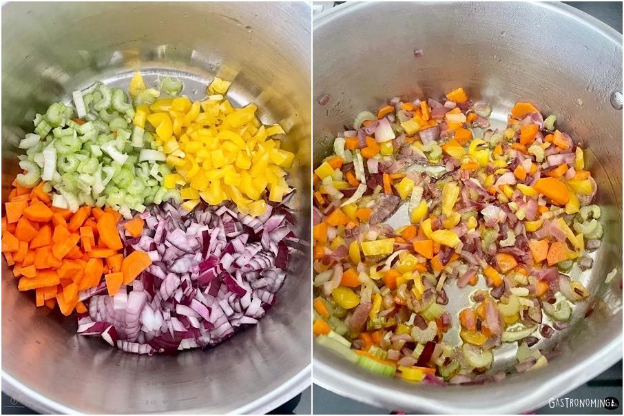 5. Puedes hacerla antes o después de la cocción de la carne y necesitas poner el aceite de oliva en una olla a fuego medio y sofreír la cebolla, zanahoria, pimiento y apio moviendo constantemente unos 12 minutos hasta que empiecen a caramelizar.6. Añadimos los ajos molidos y sofreímos un par de minutos más hasta añadir el laurel y el vino tinto para dejar cocinar unos 3 minutos más hasta evaporar el alcohol del vino.