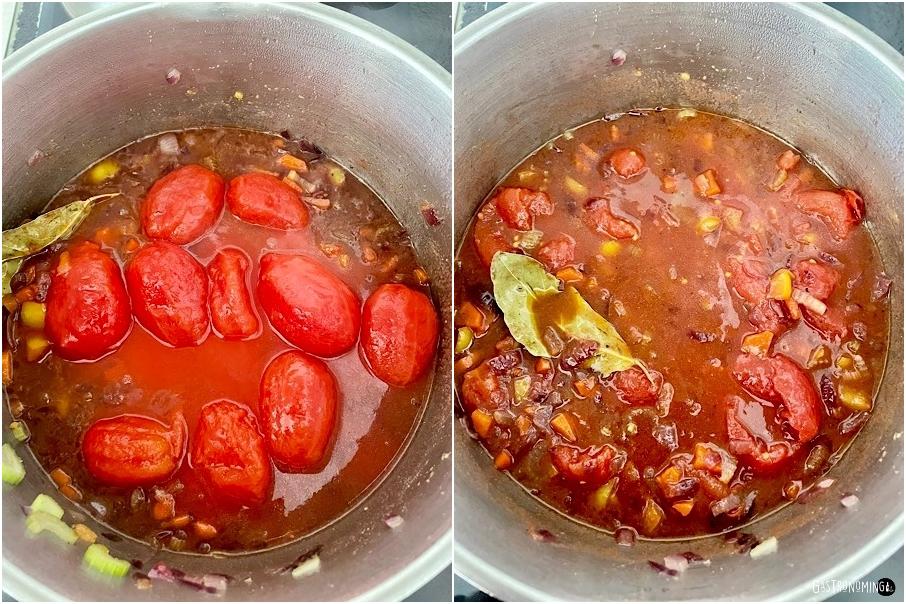 7. Es momento de añadir los jugos de la carne de su cocción y los tomates que romperemos con ayuda de una cuchara y dejar cocinar hasta que empiece a hervir, ahora tapamos, bajamos un poco el fuego y cocinamos unos 20 minutos.