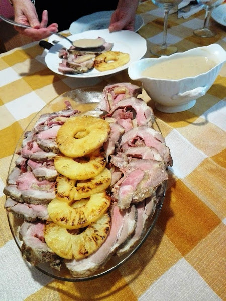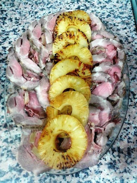 Servir la carne acompañada de una rodaja de piña y un poco de salsa.El resto de la salsa poner en una salsera.