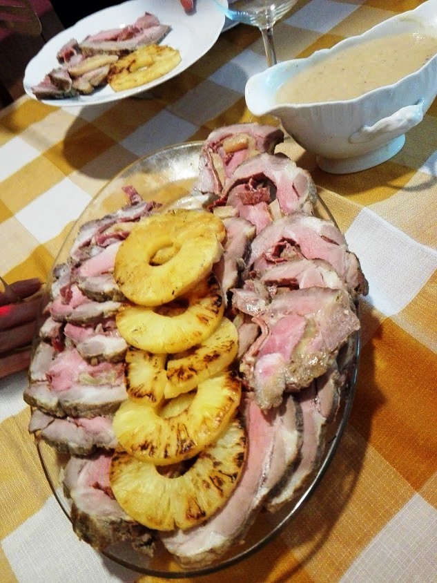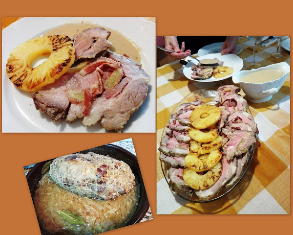 La carne de cerdo, (esta pieza que se utilizó era lomo de dos colores, por ser la carne más tierna) y la piña casan muy bien como combinación y rellenos. El toque dulce-ácido de la piña da jugosidad y sabor a esta carne y si encima queda acompañada por la salsa que la contiene, hace un equilibrio de sabores sorprendente.