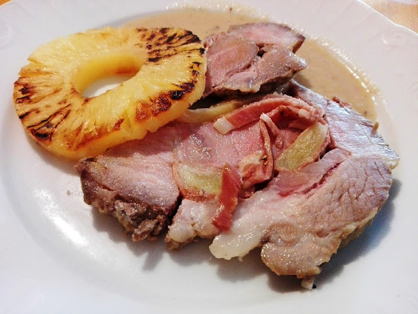 Cuando este pochada la cebolla, añadir el redondo dorado, agregar el vino, dejar evaporar el alcohol e incorporar el caldo. Dejar cocinar a fuego medio dando la vuelta al redondo y regando con el fondo líquido. Si hace falta, añadir caldo o el jugo de la piña.