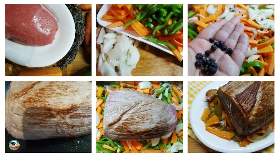 Redondo ternera asado...elaboración:1.- Lava y pica las verduras, pícalas en tiras salvo la cebolla. Esta córtala en daditos y los ajos enteros. Colócalas en una fuente de horno aderezadas con un poco de aceite de oliva, sal, el clavo, las bayas de enebro y los granos de pimienta.