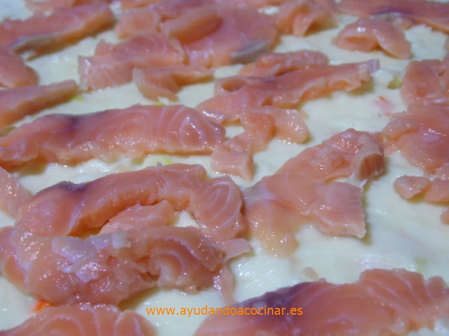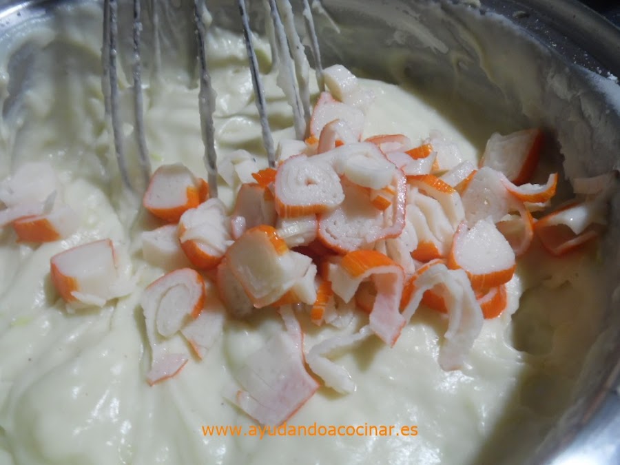 Una vez cocinada la bechamel añadir los palitos de cangrejo cortado en rodajas finas