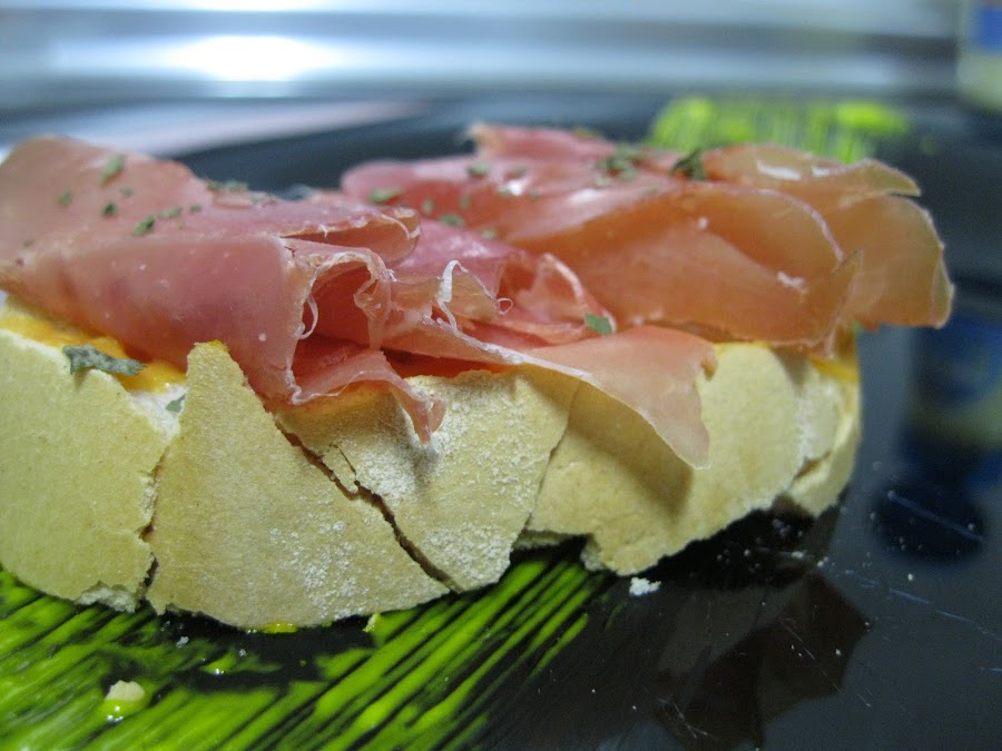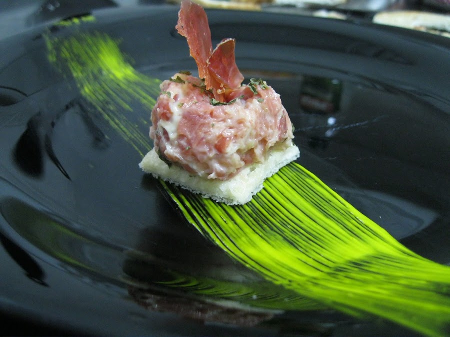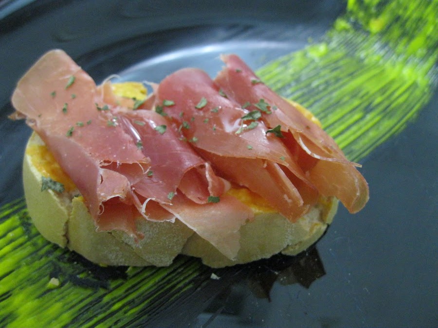 Canapé de jamón y mayonesa con crujiente de jamón: