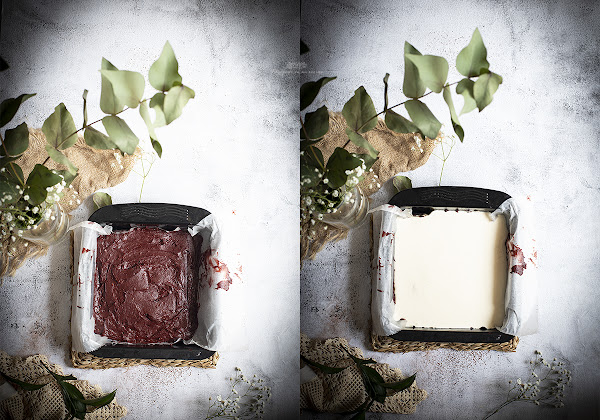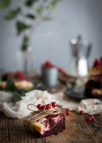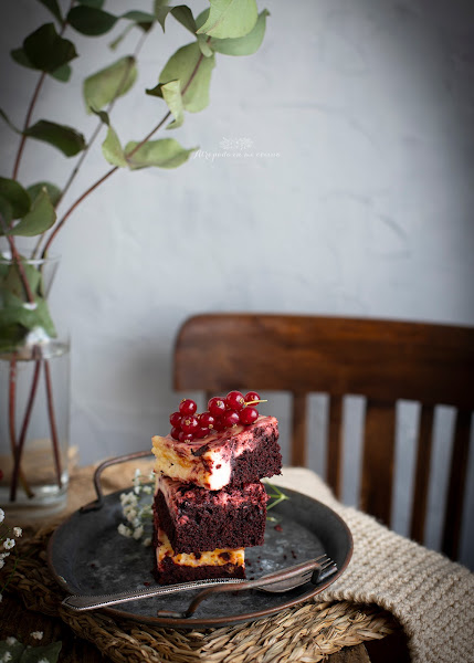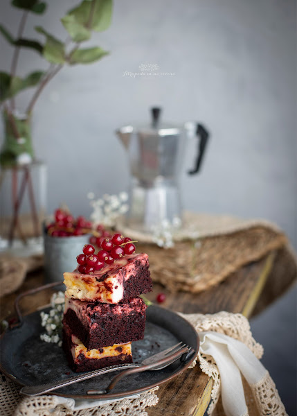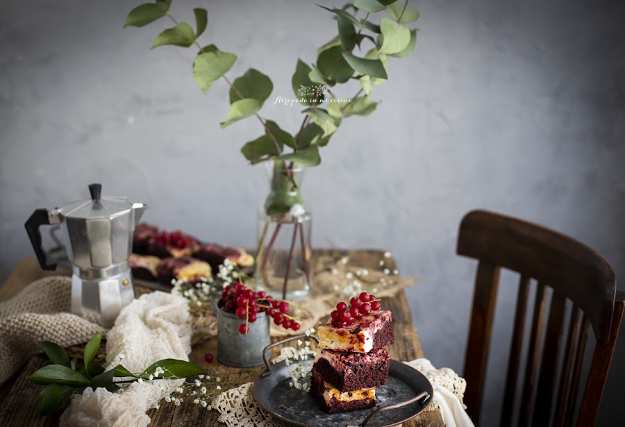 Este postre que os enseño hoy reúne tres cosas maravillosas, primero: una capa de brownie, segundo: esa capa de brownie es terciopelo rojo (red velvet) y tercero: encima lleva una capa de tarta de queso con porciones difuminadas del mismo brownie. Ya os podéis imaginar los ricos que llegan a estar estas porciones de brownie y que además se convierten en una opción perfecta para celebrar San Valentín. Podéis regalarlos individualmente en bolsitas o con papel y quedan muy vistosos además por sus colores. En definitiva, una propuesta deliciosa.