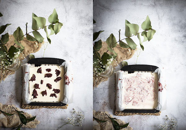 Con ayuda de un cuchillo esparcimos las cucharadas de brownie haciendo dibujos dentro de la capa de queso.