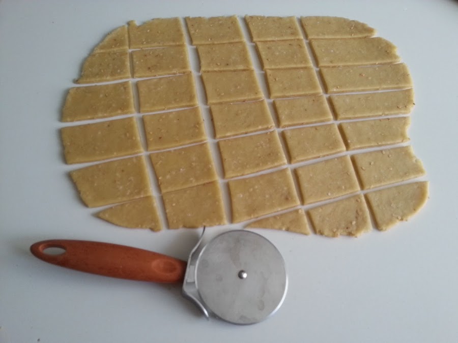 4. - Cortamos la masa en tiras de 2 o 3 cn de ancho, yo tampoco lo mido, eso es a ojo. Y luego la cortamos del largo deseado, unos 5 cm aproximadamente.