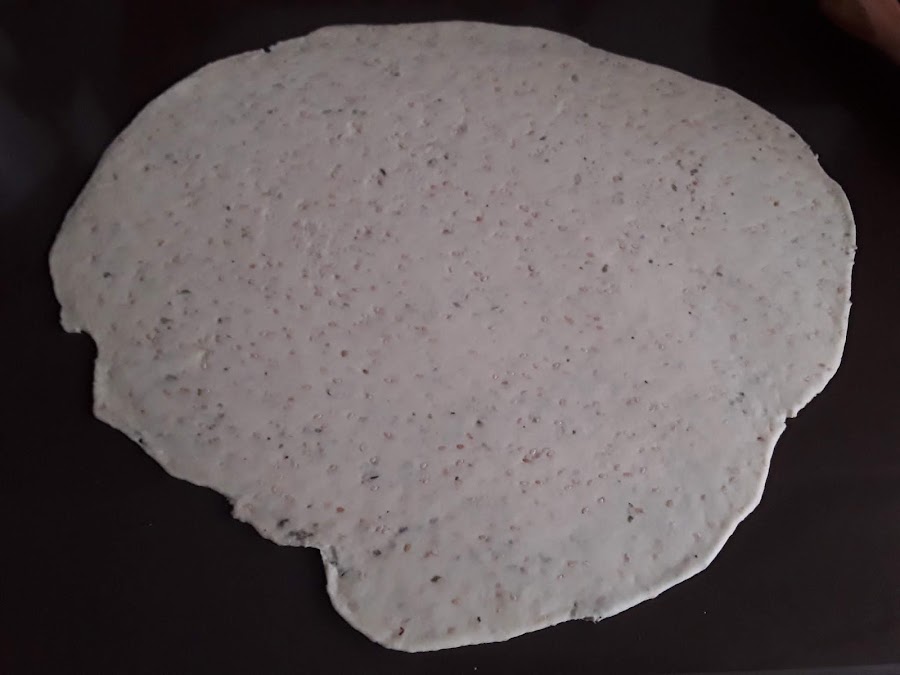 a continuación cogemos la masa y la estiramos en el banco de cocina y con la ayuda de un rodillo vamos amasando hasta que quede fina, (cuanto más fina sea la masa más crujientes quedarán),