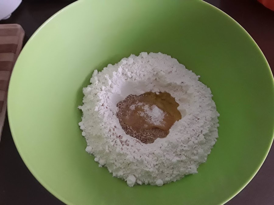 En primer lugar ponemos la harina como si fuera un volcán y vamos añadiendo todos los ingredientes (una a uno), e iremos mezclado con las manos hasta que consigamos que no se nos pegue en las manos,