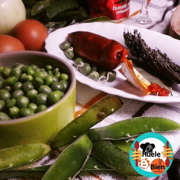 1.- Pelamos el ajo y la cebolla, lo picamos muy fino. En una olla ponemos un poco de aceite, rehogamos la cebolla y el ajo unos minutos. Cortamos en el chorizo en rodajas, le quitamos la piel. Lo incorporamos, añadimos el laurel, el tomillo, las hebras de azafrán y la sal. Cocinamos a fuego medio 5 minutos, removiendo de vez en cuando con una cuchara de madera. Vertemos el vino y dejamos reducir, añadimos el tomate y las arvejas desgranadas. Añadimos 2 vasos de agua, llevamos a ebullición y bajamos el fuego. cocinamos 30 minutos, incorporado vez en cuando un poco de agua y removiendo para que no pegue al fondo de la olla.