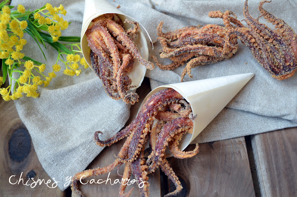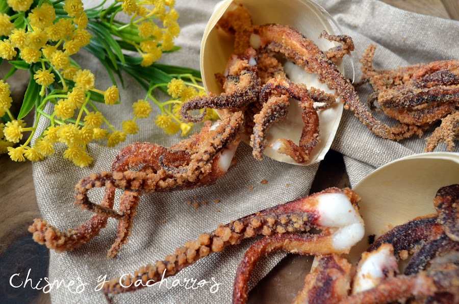 Necesitamos una bolsa limpia, en ella poner la harina y la sal. Meter los rejos y cerrar la bolsa, ahora mover la bolsa para que se mezcle todo bien y los rejos tomen la harina y la sal. Calentar en una sartén o freidora el aceite, tiene que estar muy caliente. Y añadiendo las patas sin cortar dejar freír sobre todo insistir en la zona más gruesa, poner con las patas para arriba y que se haga bien la parte inferior. Dejar freír unos cuantos minutos hasta que esté bien hecho. Sacar y poner sobre papel absorbente. Seguir friendo en tandas.