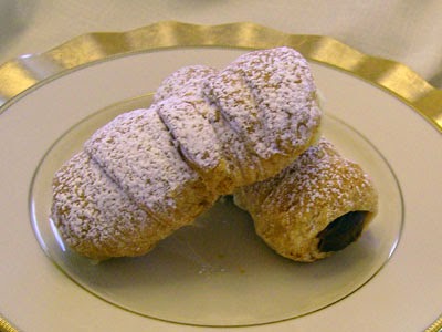 en una superficie rocie harina con un rodillo extienda cada pasta de hojaldre que quede de 3cm de grueso barnize con la mantequilla suave los tres pliegos corte tiras de 8cm de ancho en conos de metal arrolle la pasta a formar como cuernitos coloquelos sobre una cazoleja y hornee a 350grados f por 25min o a que dore bien la pasta ya horneados dejelos enfriar dentro del horno,ahora prepare el relleno en una olla coloque los higos,jugo de naranja,canela cocine hasta que reduzca por completo el liquido reserve a enfriar,rellene los cuernitos ya frios al servirlos rocielos con azucar en polvo.