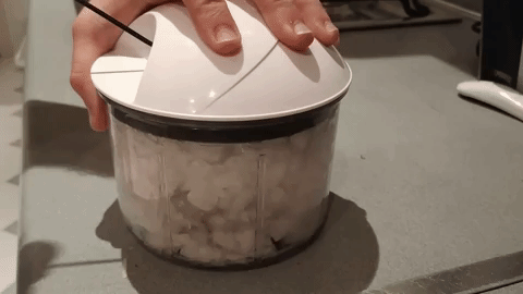 Pelamos la cebolla y la picamos bien a mano o en una picadora, los trozos más o menos pequeños según nos guste encontrarlos o no. De todas formas la vamos a pochar bien y va a quedar muy blanda.