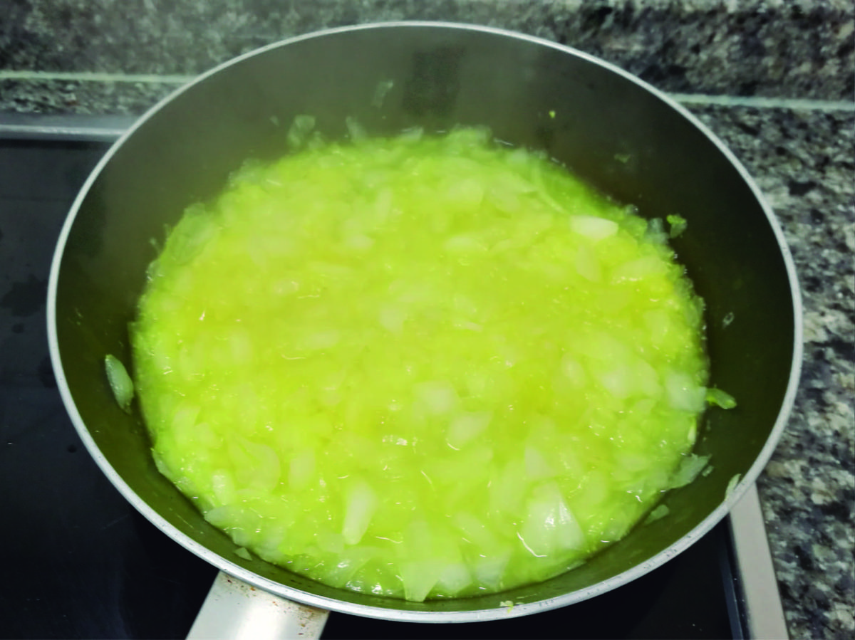 Con el bicarbonato conseguimos hacer la cebolla sin aceite, pues si son cebollas dulces van soltando su propio jugo, si no lo son y vemos que se secan mucho le echamos un poco de agua para que no se peguen y las hacemos hasta que estén bien pochada.