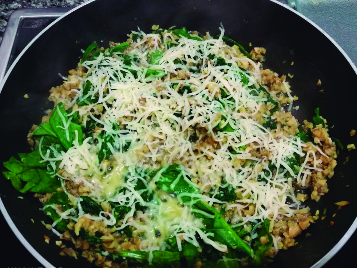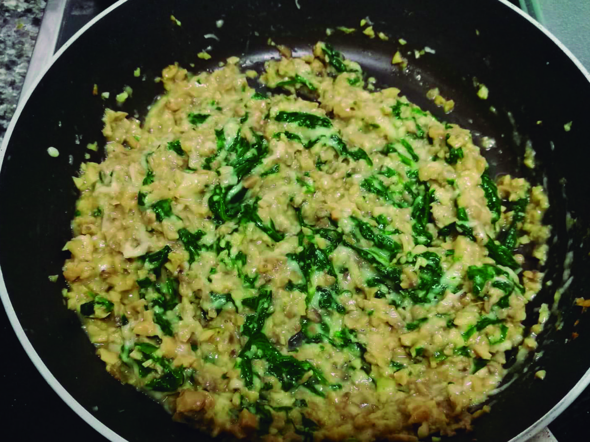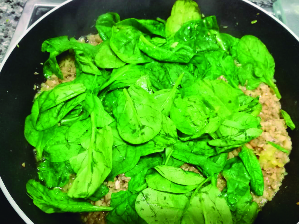 Echamos las espinacas, removemos bien y lo tapamos un par de minutos hasta que se hagan.