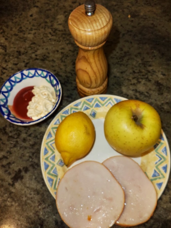 Pongo en el vaso el fiambre de pollo, la manzana (pelada y cortada en dados pequeños), el zumo de medio limón y la pimienta. Bato 6 segundos a velocidad 5.