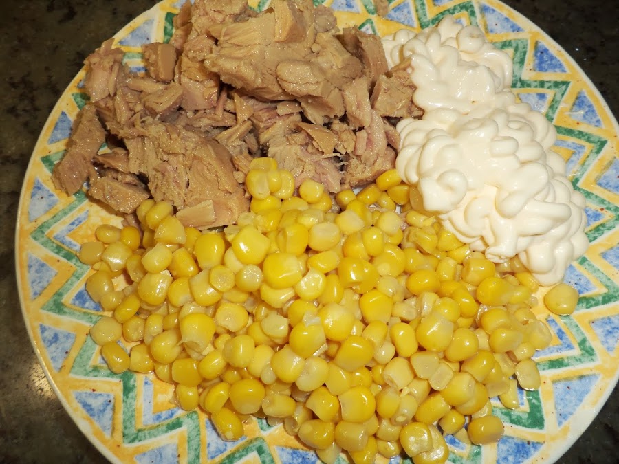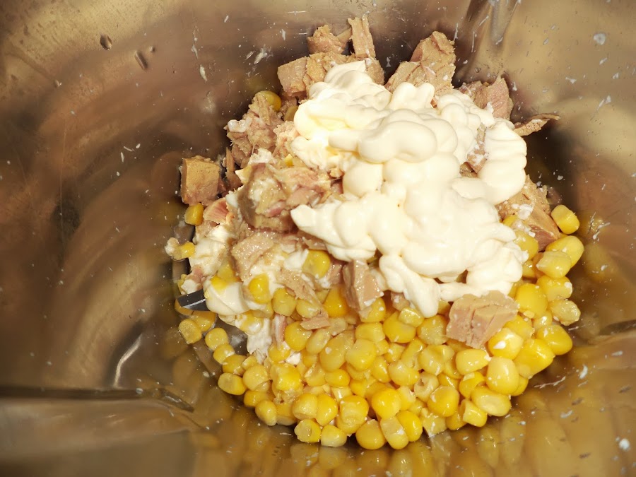 Pongo todos los ingredientes (el atún, el maíz y la mahonesa) juntos en el vaso y bato 15 segundos a velocidad 5.