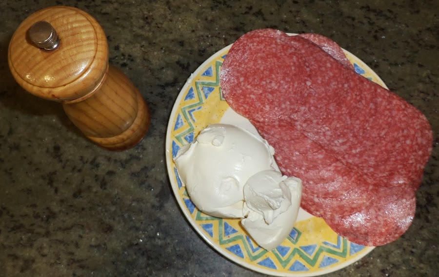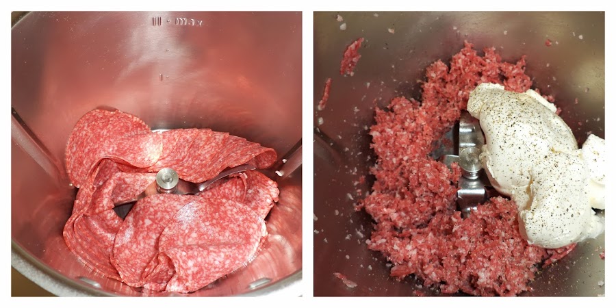 Pico el salami 8 segundos a velocidad 5. Añado la pimienta y el queso y bato 10 segundos a velocidad 3.