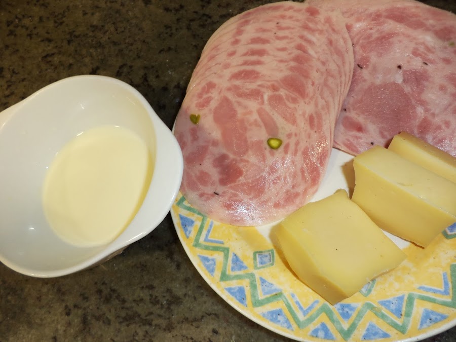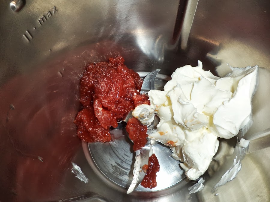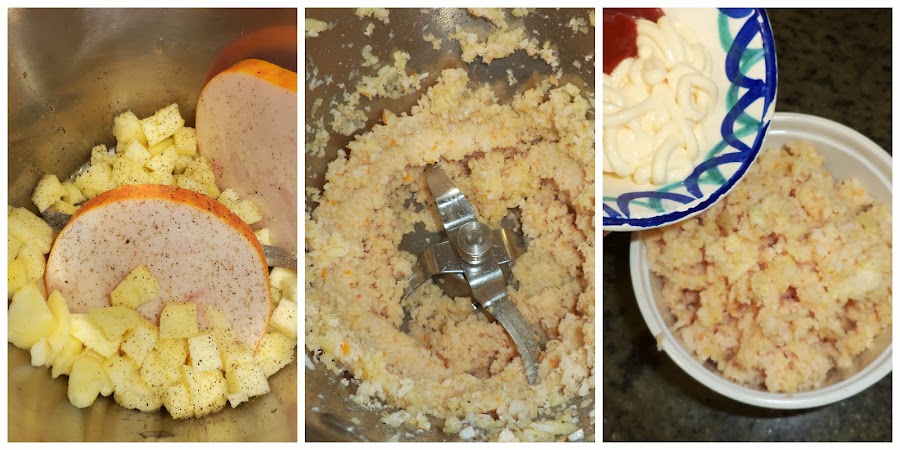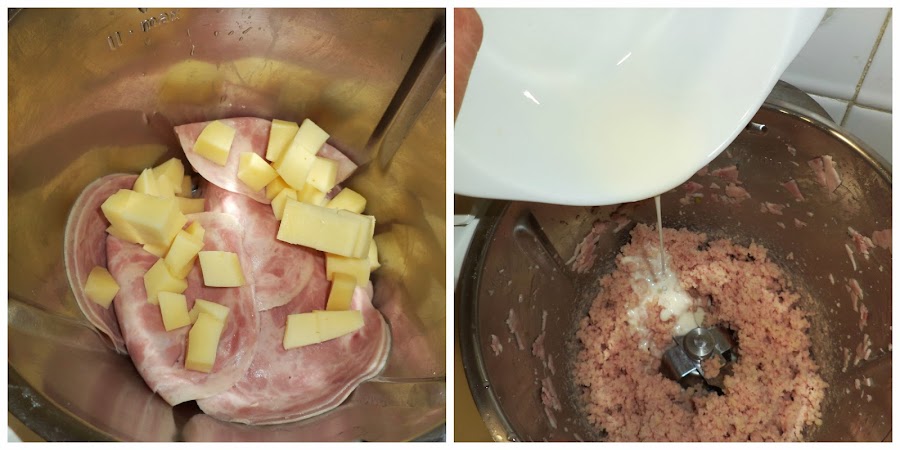 Pongo en el vaso el fiambre de pavo y el queso y pico durante 10 segundos a velocidad 6. Añado la nata (crema de leche) y bato 5 segundos a velocidad 3.