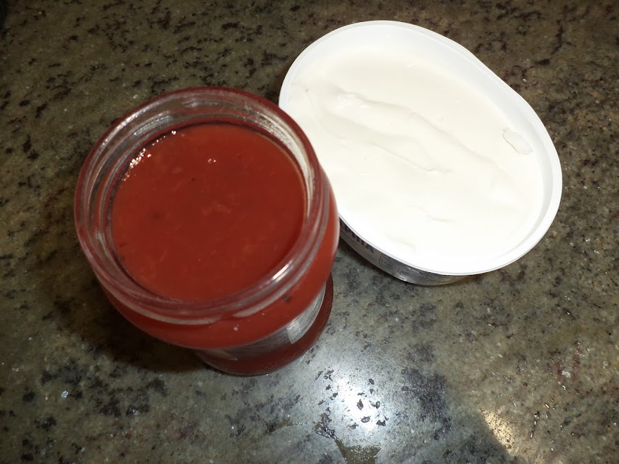 Pongo la mezcla en un cuenco y añado la mahonesa y el kétchup. Remuevo bien